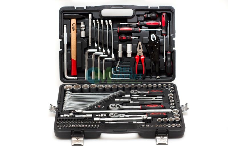 Элементы набора упакованы в чемодан, изготовленный из пластика 1-й пробы, имеет металлические прочные замки, а также удобную ручку для транспортировки. Для удобства поиска все детали аккуратно рассортированы по специальным обозначенным отсекам. Чемодан защищает инструменты от пыли, влаги и повреждений. Габариты чемодана (длина*ширина*высота*глубина): 590*400*75 мм.