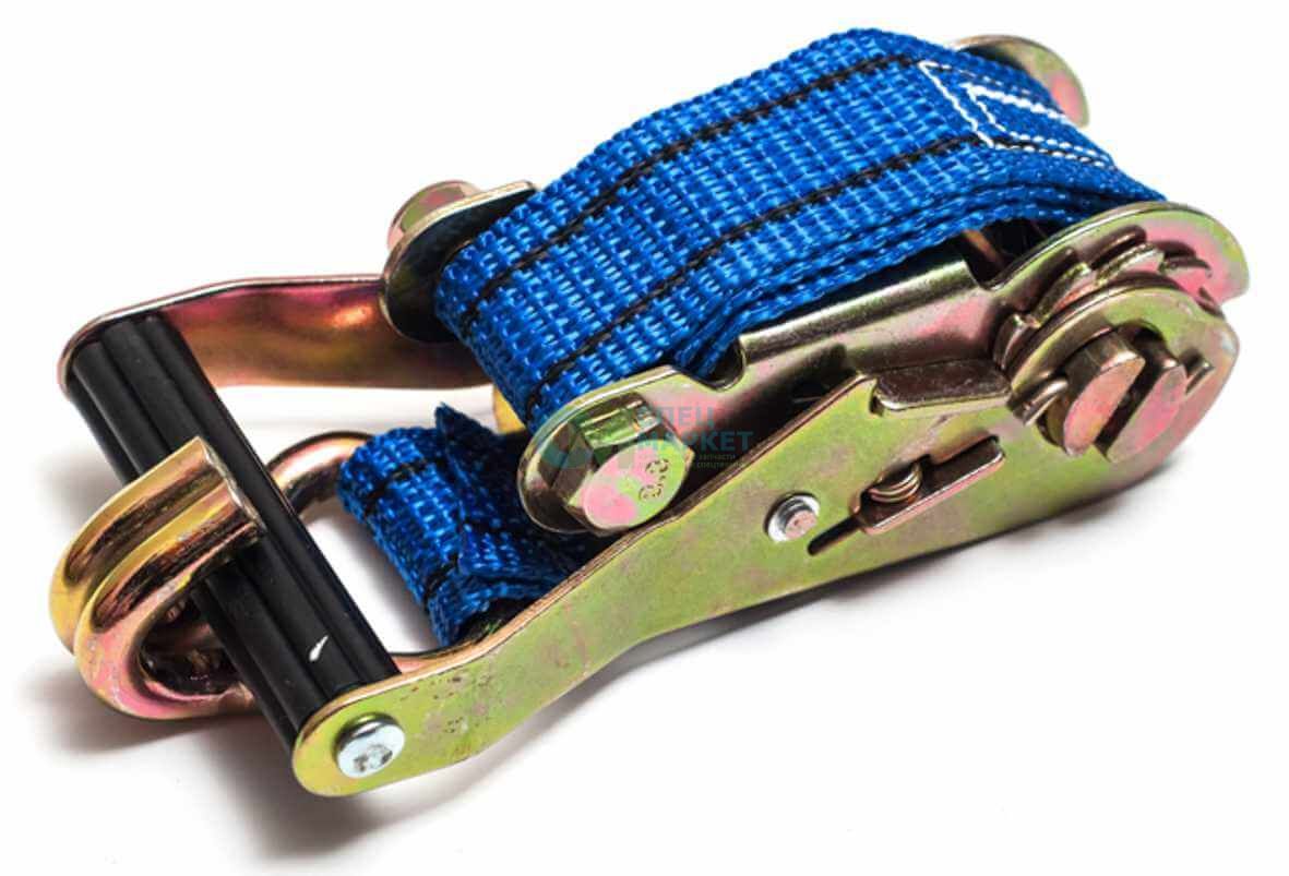 Стяжка груза состоит из ленты, храпового механизма и двойных крюков. Лента изготовлена из 100% полипропилена, материал отличается прочностью и долговечностью. Ширина ленты составляет 35 мм, что обеспечивает оптимальное распределение нагрузки. Длина ленты – 6 метров, позволяющая закрепить даже крупногабаритные грузы. Храповой механизм выдерживает нагрузку до 2 тонн, а широкая лента обеспечивает удобство использования. Двойные крюки изготовленные из прутка 8 мм стали 3 марки, обеспечивают надежное крепление ленты к транспортному средству.